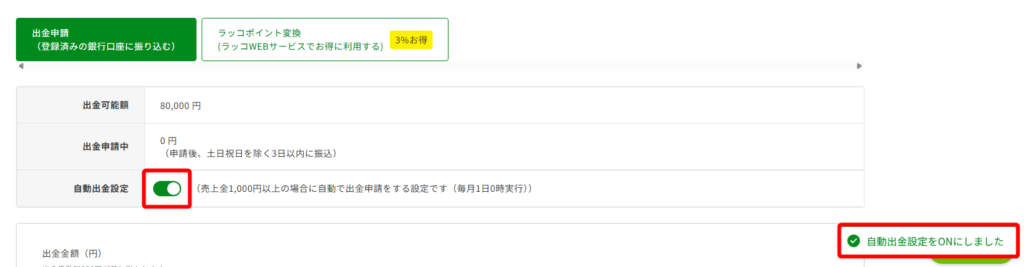 自動出金設定を「ON」にすることで、売上金1,000円以上の場合に自動で出金申請されます。(毎月1日0時実行)